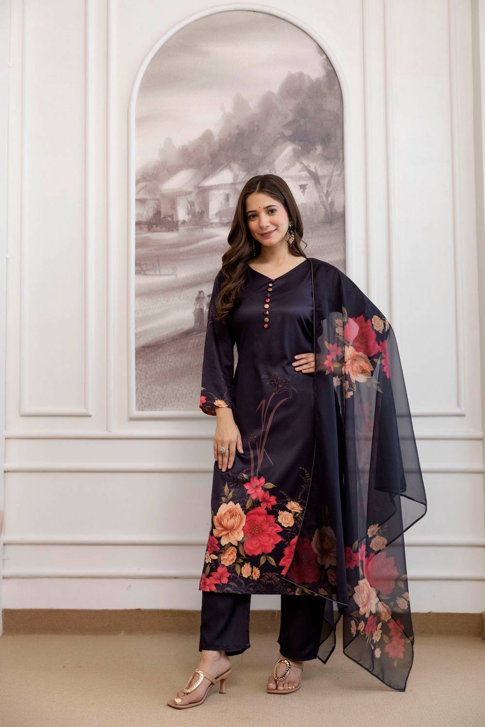 Black Floral Printed Silk Straight Cut Suits