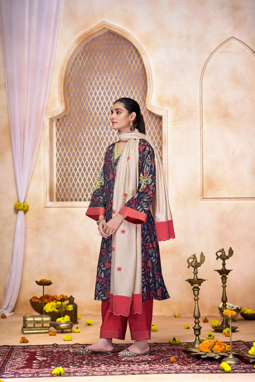 Navy Blue Floral Printed Modal Chanderi Straight Cut Suit Set