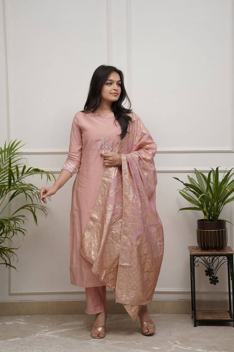Peach Embroidered Chanderi Straight Cut Suit Set