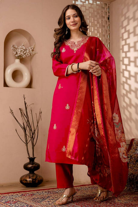 Pink Floral Embroidered Silk Straight Cut Suits