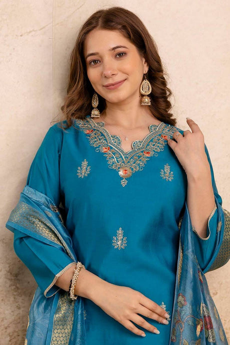 Turquoise Embroidered Silk Straight Cut Suits