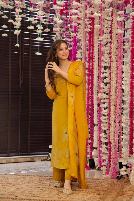 Regular price $340.00 USDUnit price /UnavailableYellow Floral Printed Silk Straight Cut Suit Set