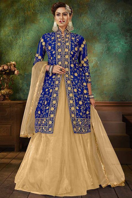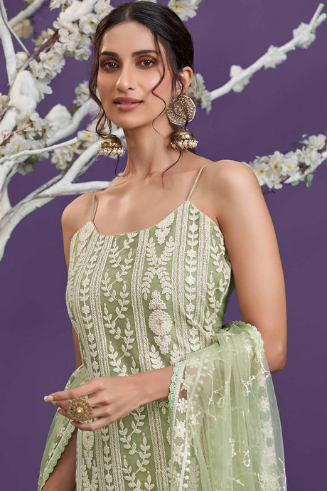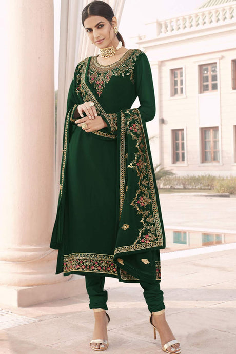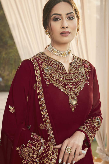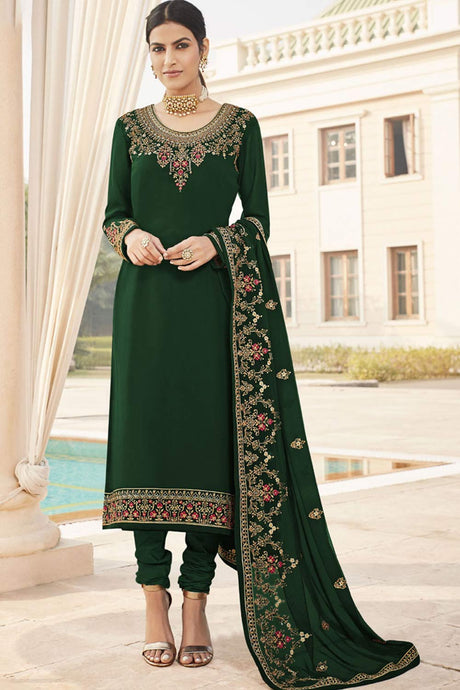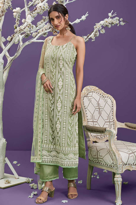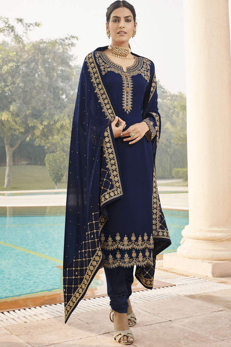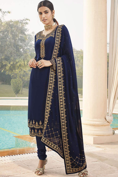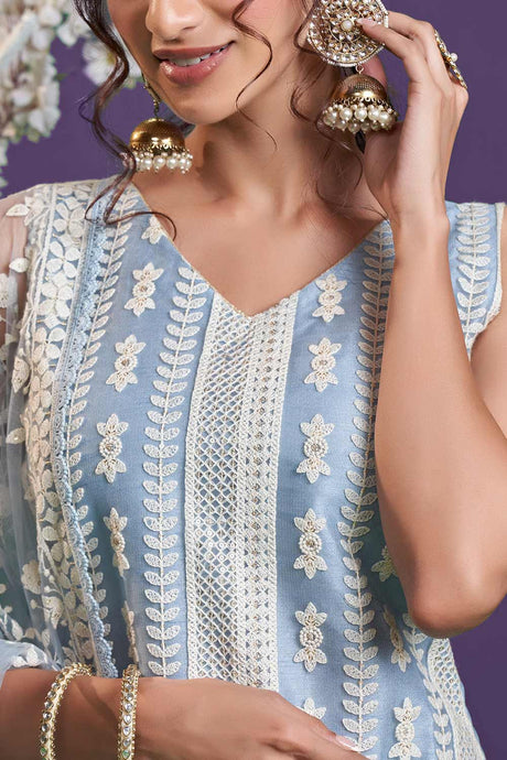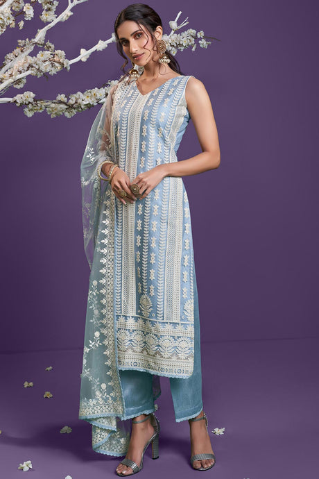 Faux Georgette Embroidery Suit Set In Aqua Blue