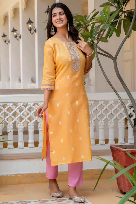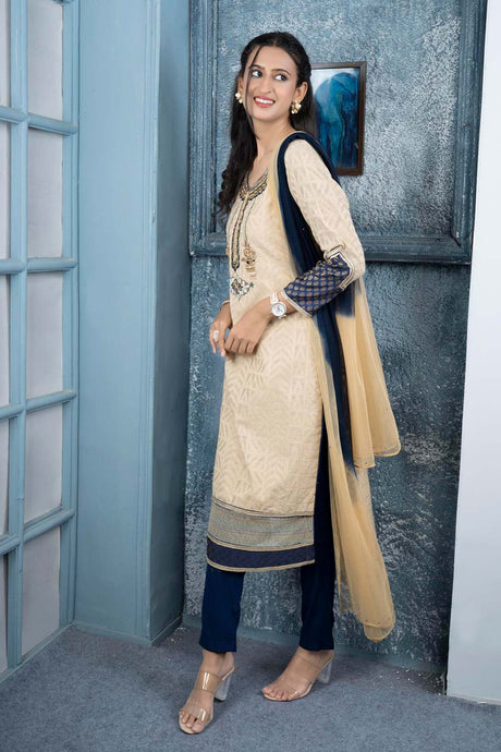 Beige Embroidered Silk Stitched Trouser Kurti With Dupatta