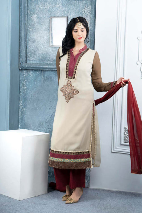 Beige Embroidered Georgette Stitched Palazzo Kurti With Dupatta