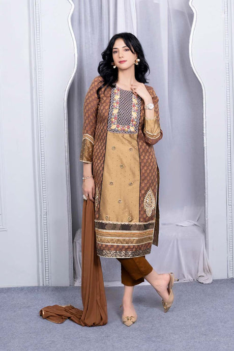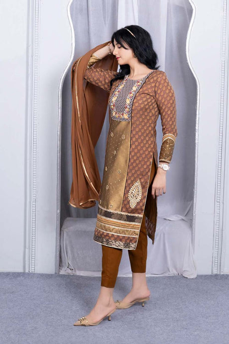 Brown Embroidered Silk Stitched Trouser Kurti With Dupatta