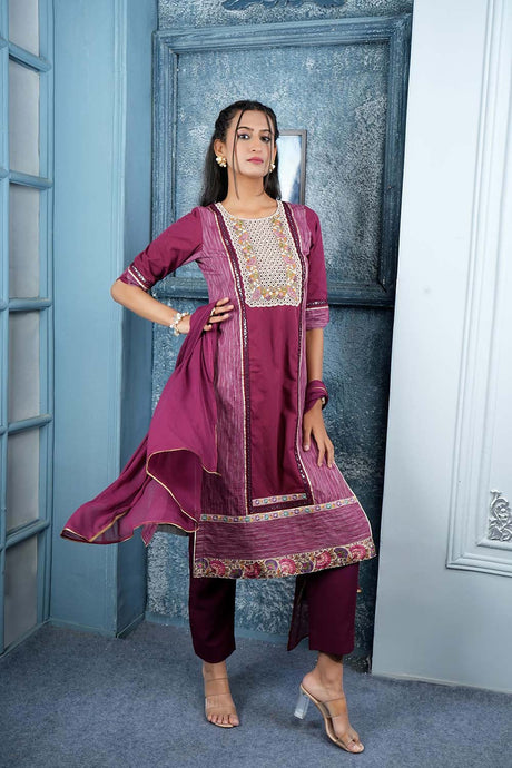 Maroon Embroidered Silk Stitched Trouser Kurti With Dupatta
