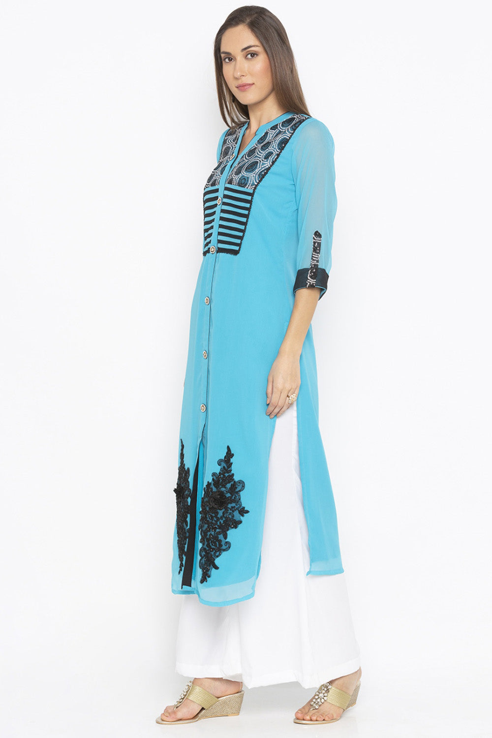 Blue georgette straight cut Kurti with black and white Sequins embroidered yoke and black ribbon and Sequins embroidery motifs in ghera.