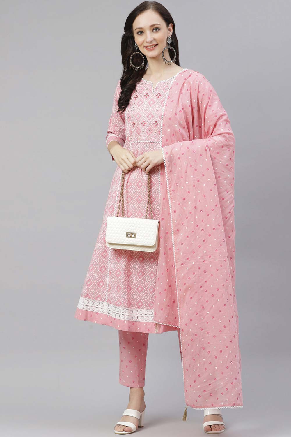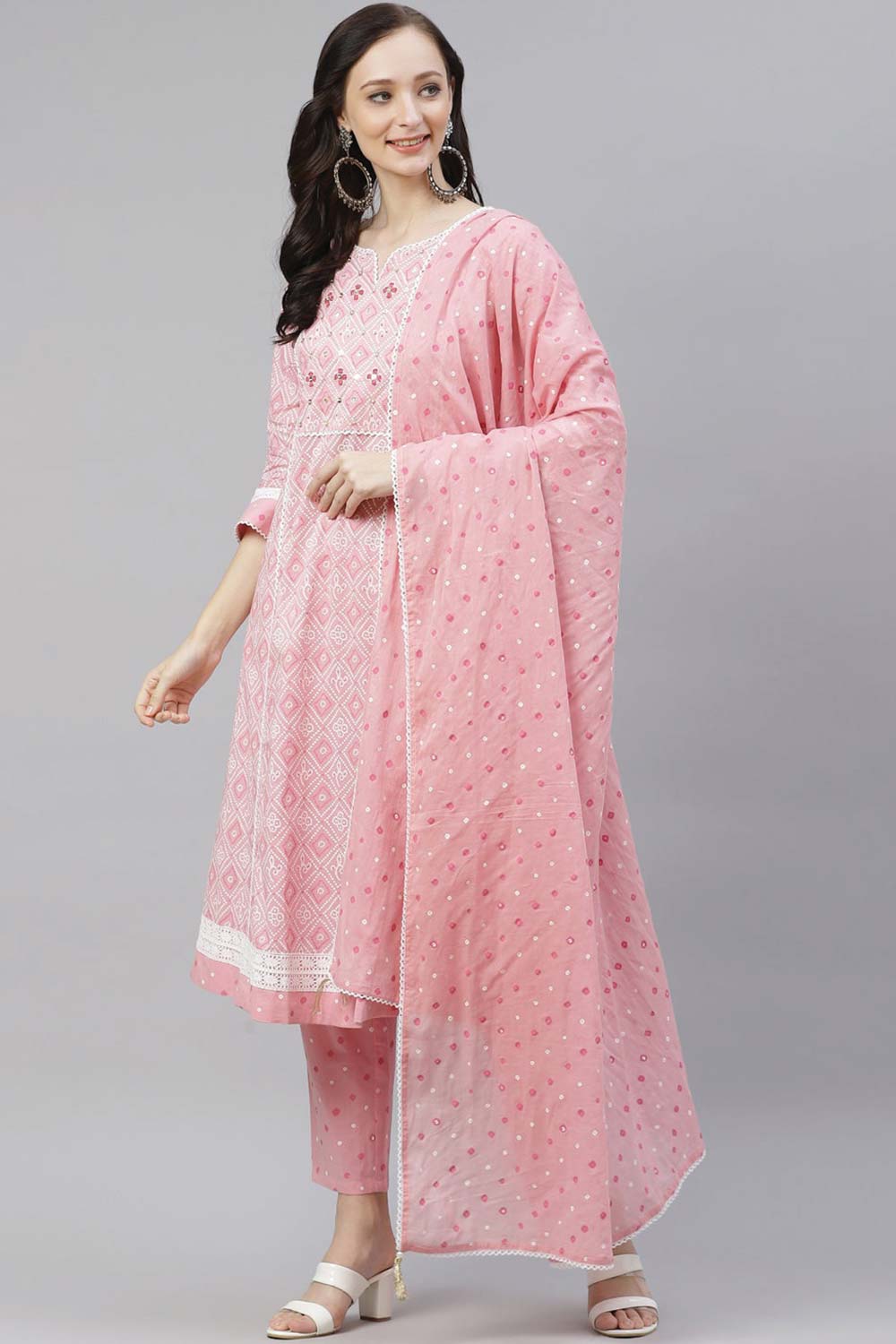 Pink Cotton A-Line Kurta Pant Set With Dupatta