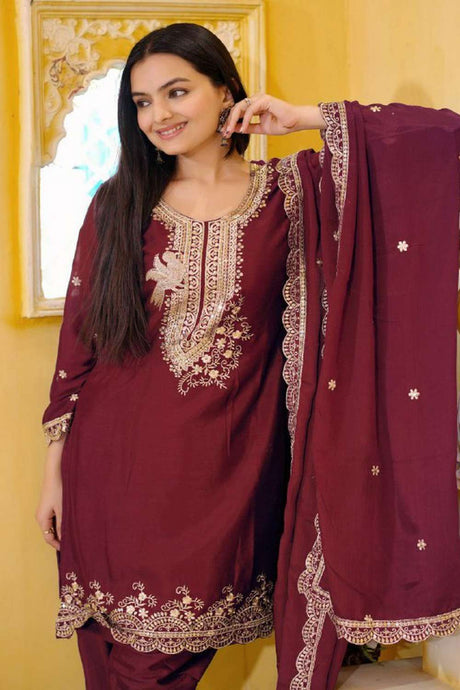 Wine Sequin with Embroidered Art Silk Sharara Suit Set