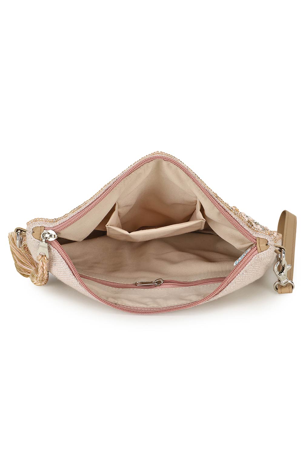 Pastel Pink Jacquard & Leather Ethnic Motifs Embellished Sling Bag