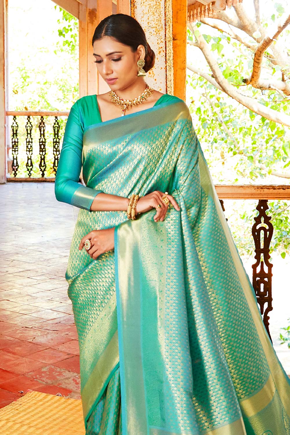 The Kandini Silk Sea Green Woven Handloom Saree is an elegant and refreshing garment that merges the serene beauty of sea green with the intricate artistry of handloom weaving.