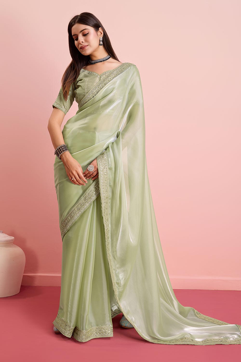 Pista Jimmy Choo Embroidered Saree