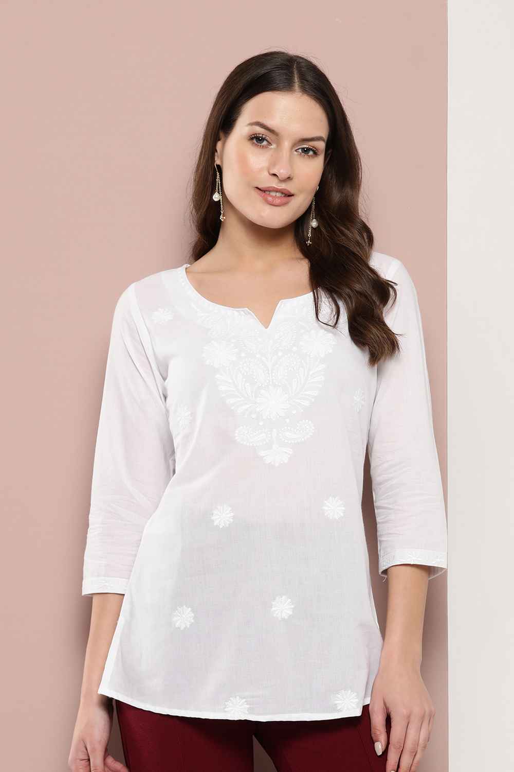 Stay on-trend with our Top a perfect choice for the modern woman. Crafted with lightweight Pure Cotton this piece is designed to keep you comfortable and chic all day long. The Chikankari add a contemporary edge, making it a versatile wardrobe staple. Whether for casual outings, this top/tunic seamlessly elevates your style Pair it with skinny jeans, a tote bag, and loafers for a Casual vibe or statement earrings and wedges for a more polished look. Add an effortless flair to your wardrobe with Top
