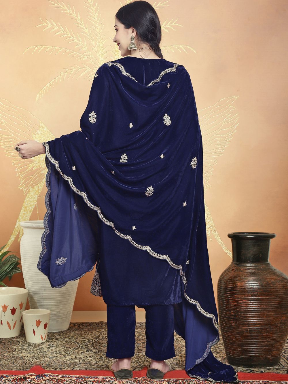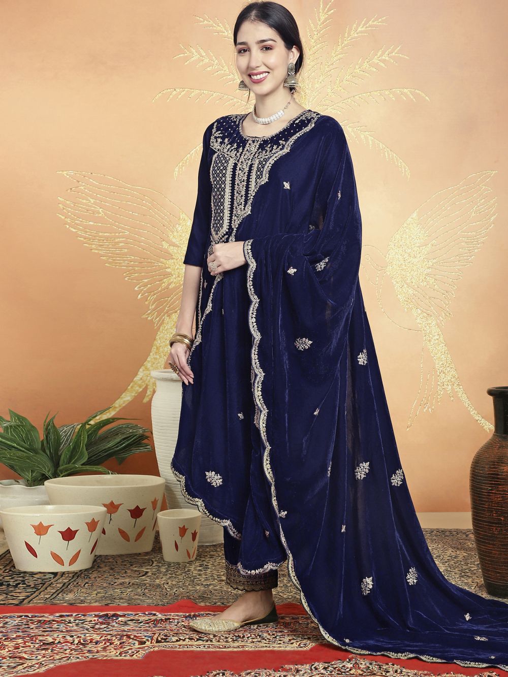 Navy Blue Velvet Embroidered Straight Cut Suits