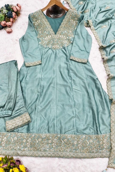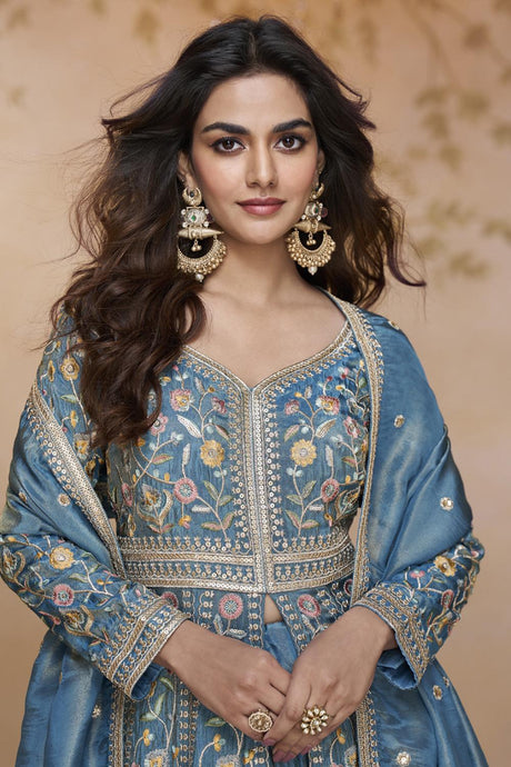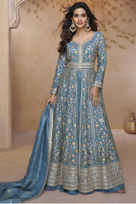 Blue Sequin with Embroidered Chinon Palazzo Suits