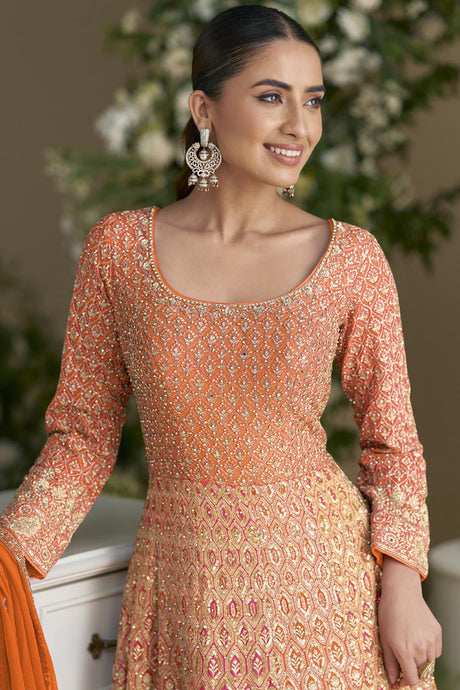 Orange Sequin with Floral Embroidered Art Silk Kurti Pant Set