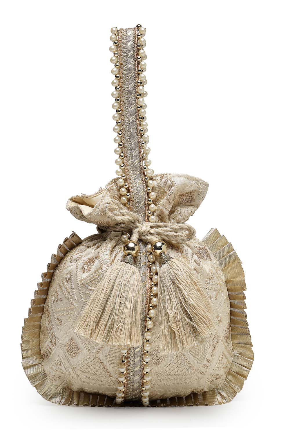 Droop Biege And Gold Embroidered Faux Silk Potli