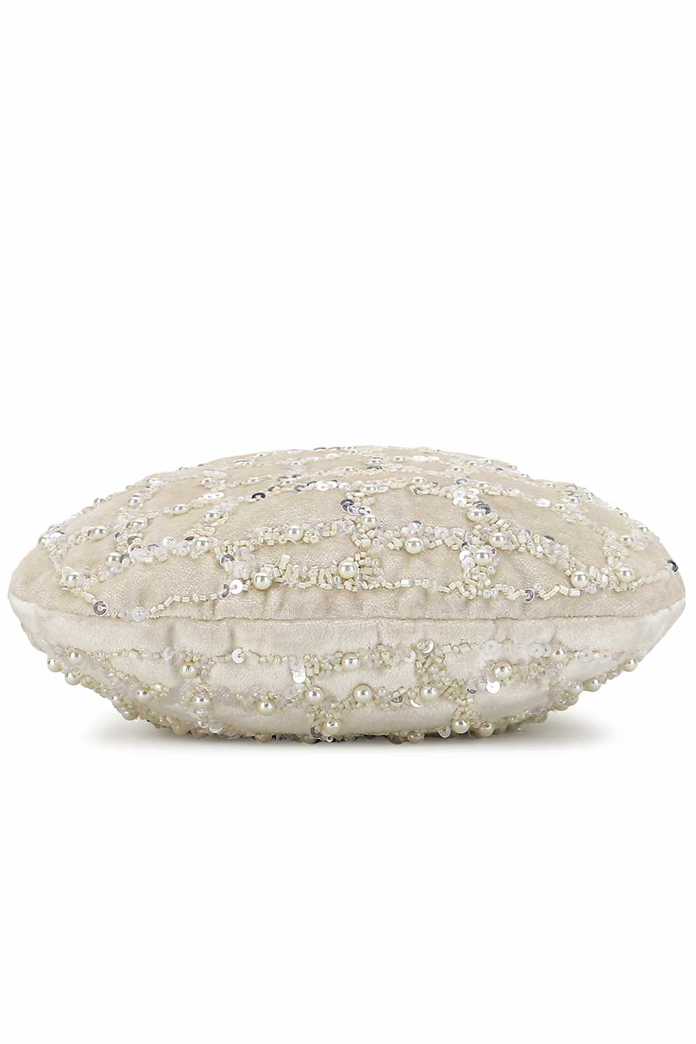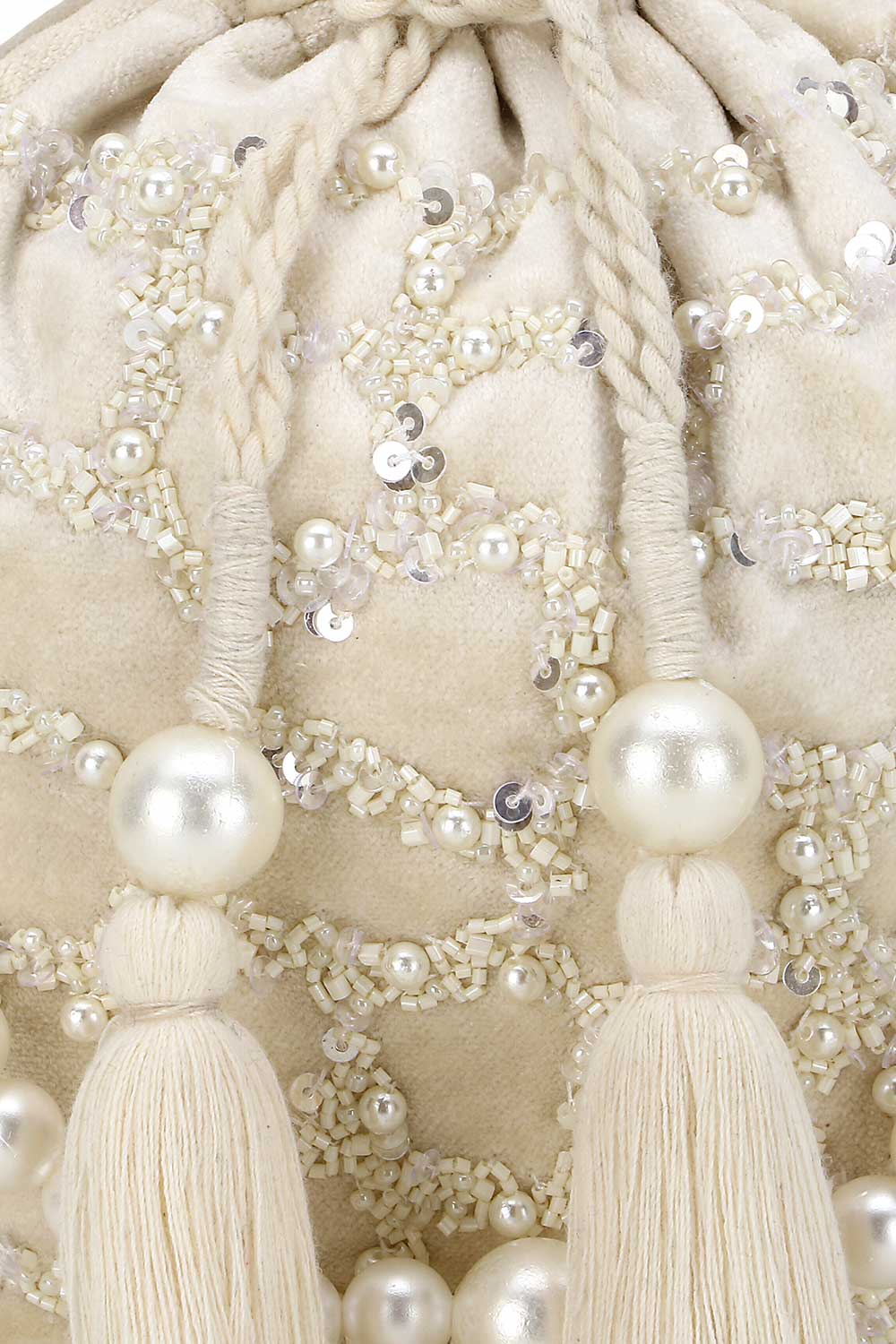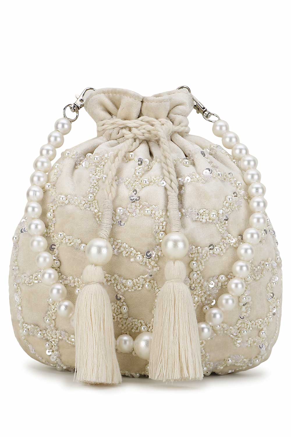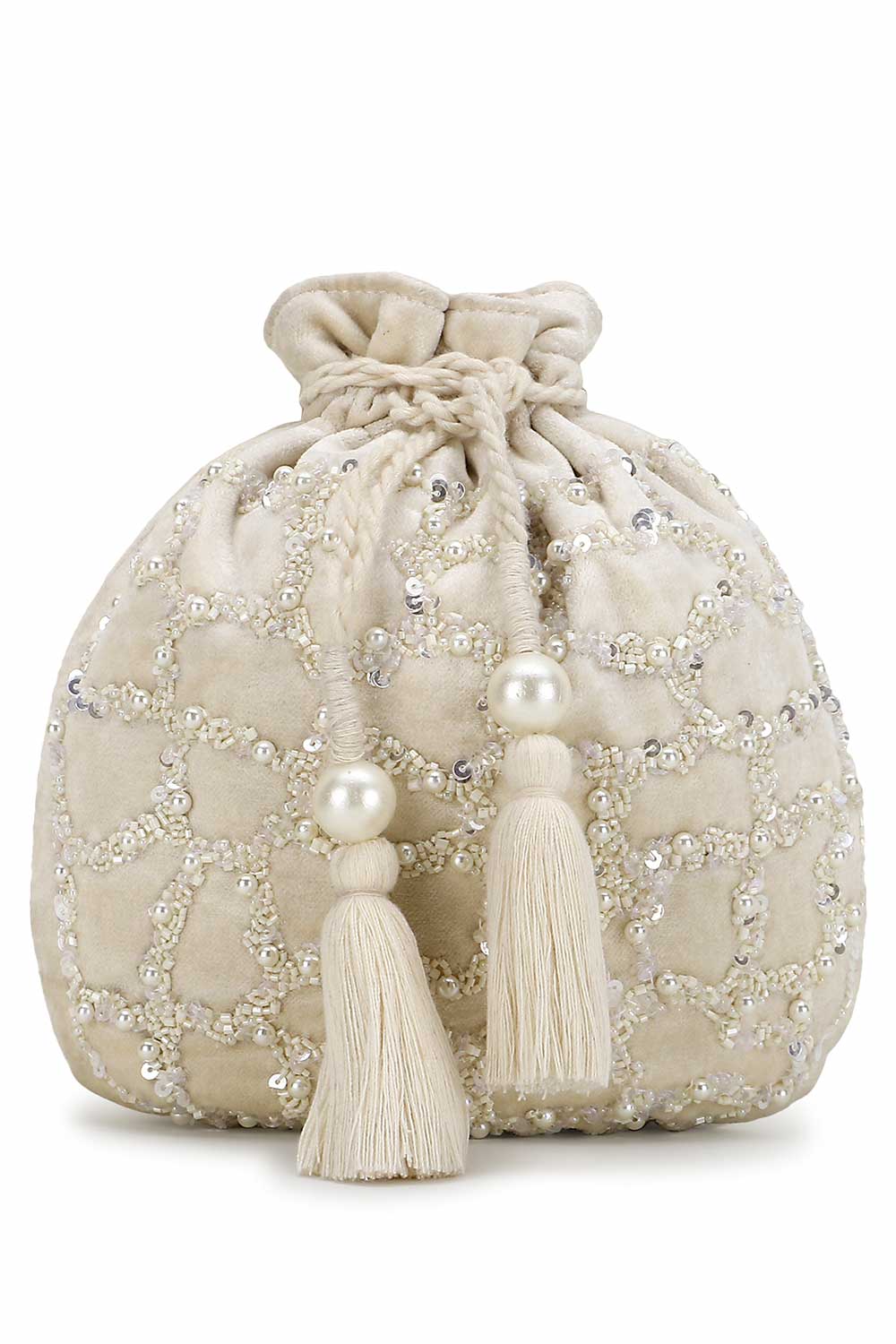 Add elegance & finesse to your look Off White Potli Clutch. It features an Embellished pattern on Velvet fabric. Has a Detachable Wrist loop secured with a Drawstring closure.