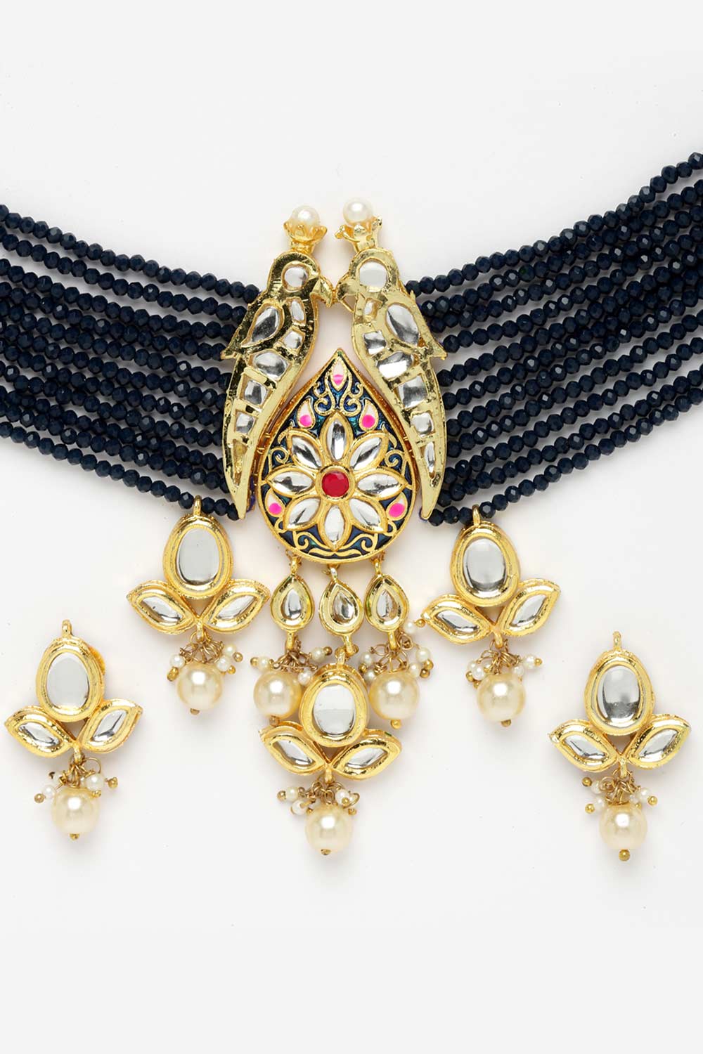 Blue And Pink Gold-Plated Kundan And Pearls Necklace Earring Sets