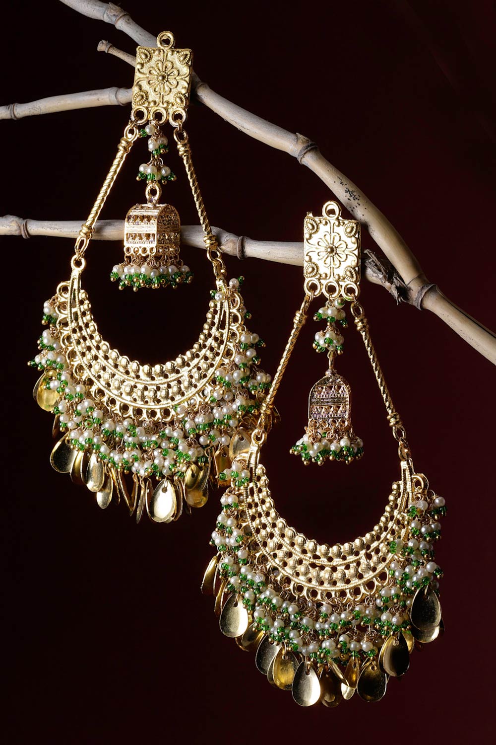 Gold And Green Chand Bali Earring With Pearls And Natural Stones