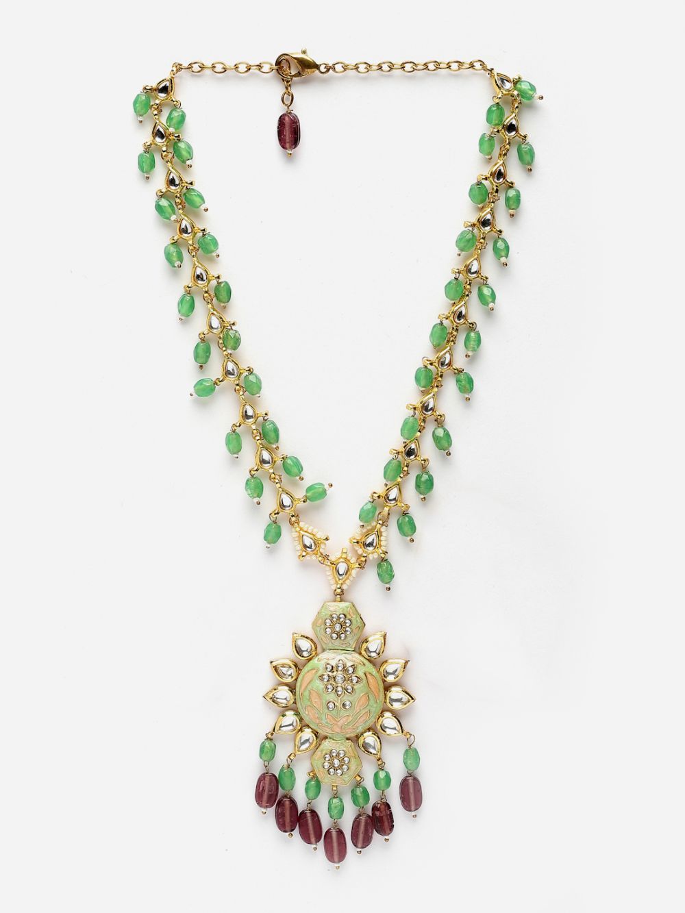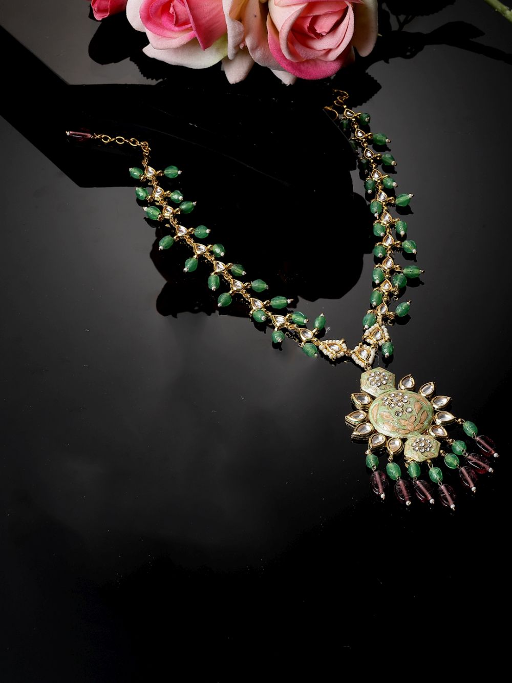 Green And Maroon Haar Necklace With Kundan And Pearls