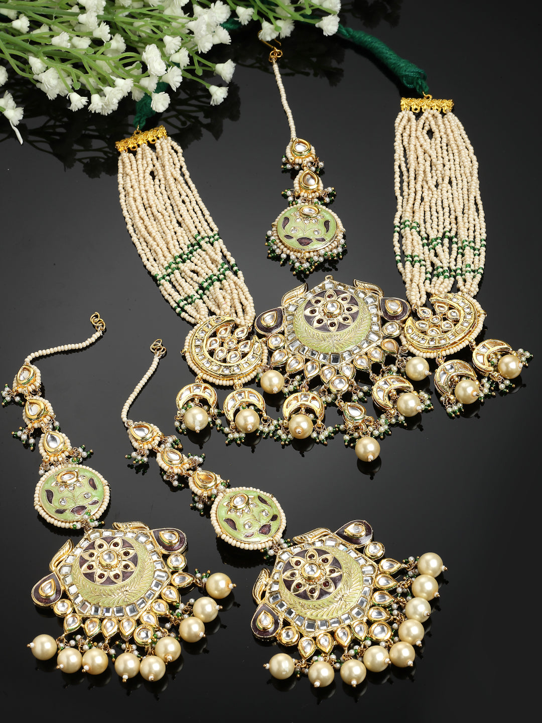 Green And Cream Gold-Plated Kundan And Pearls Necklace Earring Set With Maang Tikka