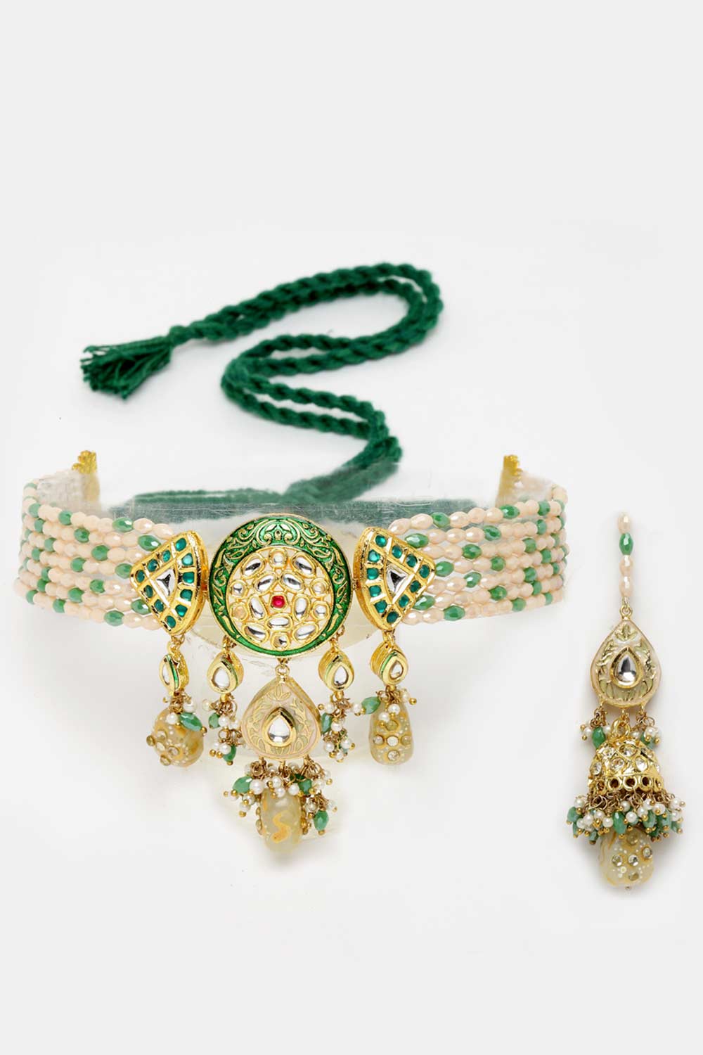 Green & Cream Necklace With Earring Jewellery Set With Kundan & Pearls