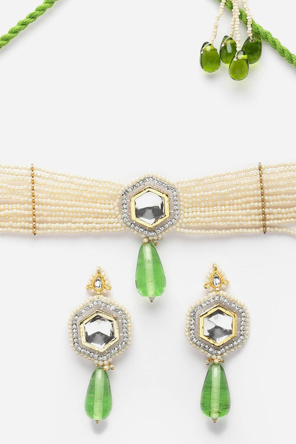 Green And Cream Necklace With Earring Jewelry Set With Kundan And Pearls