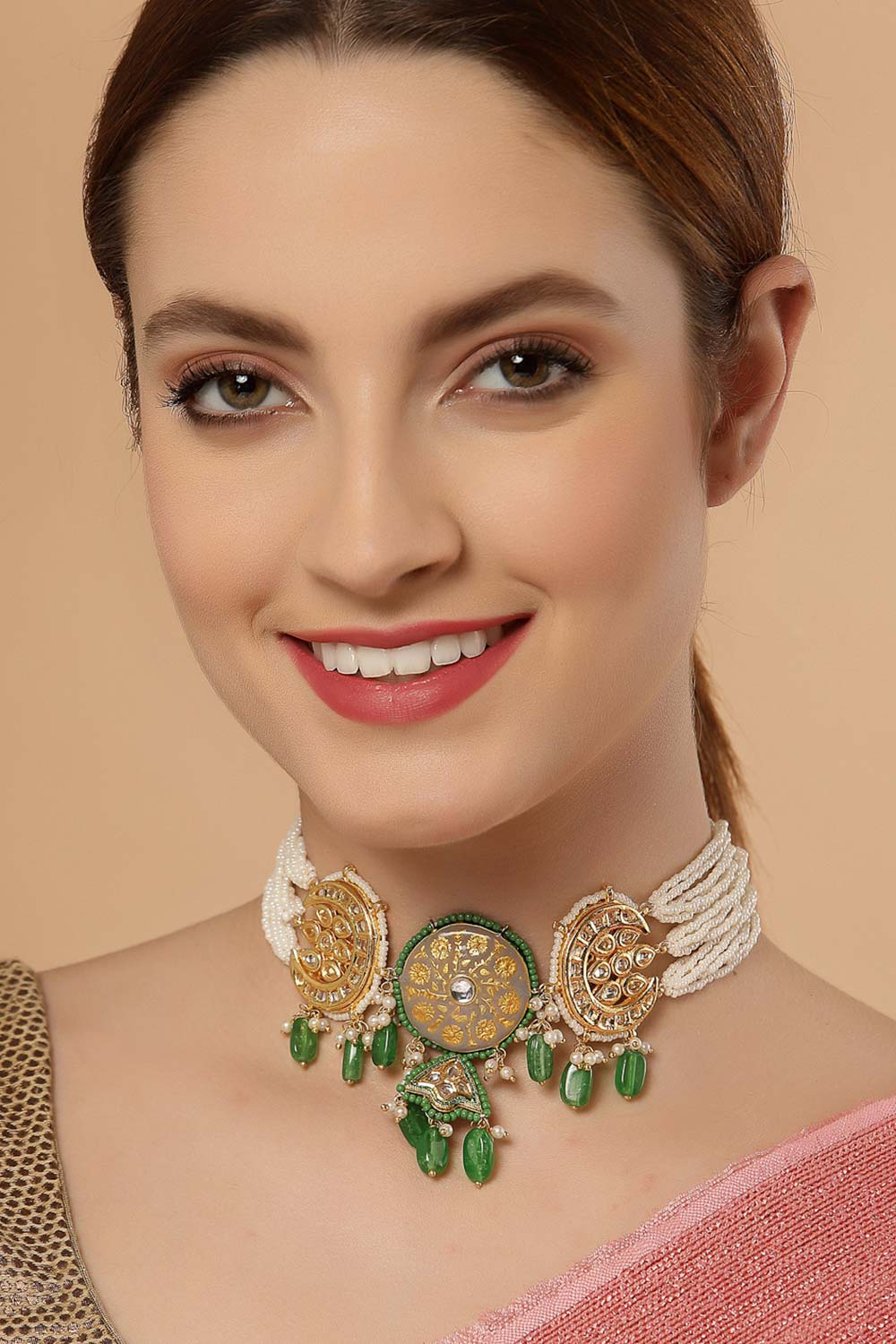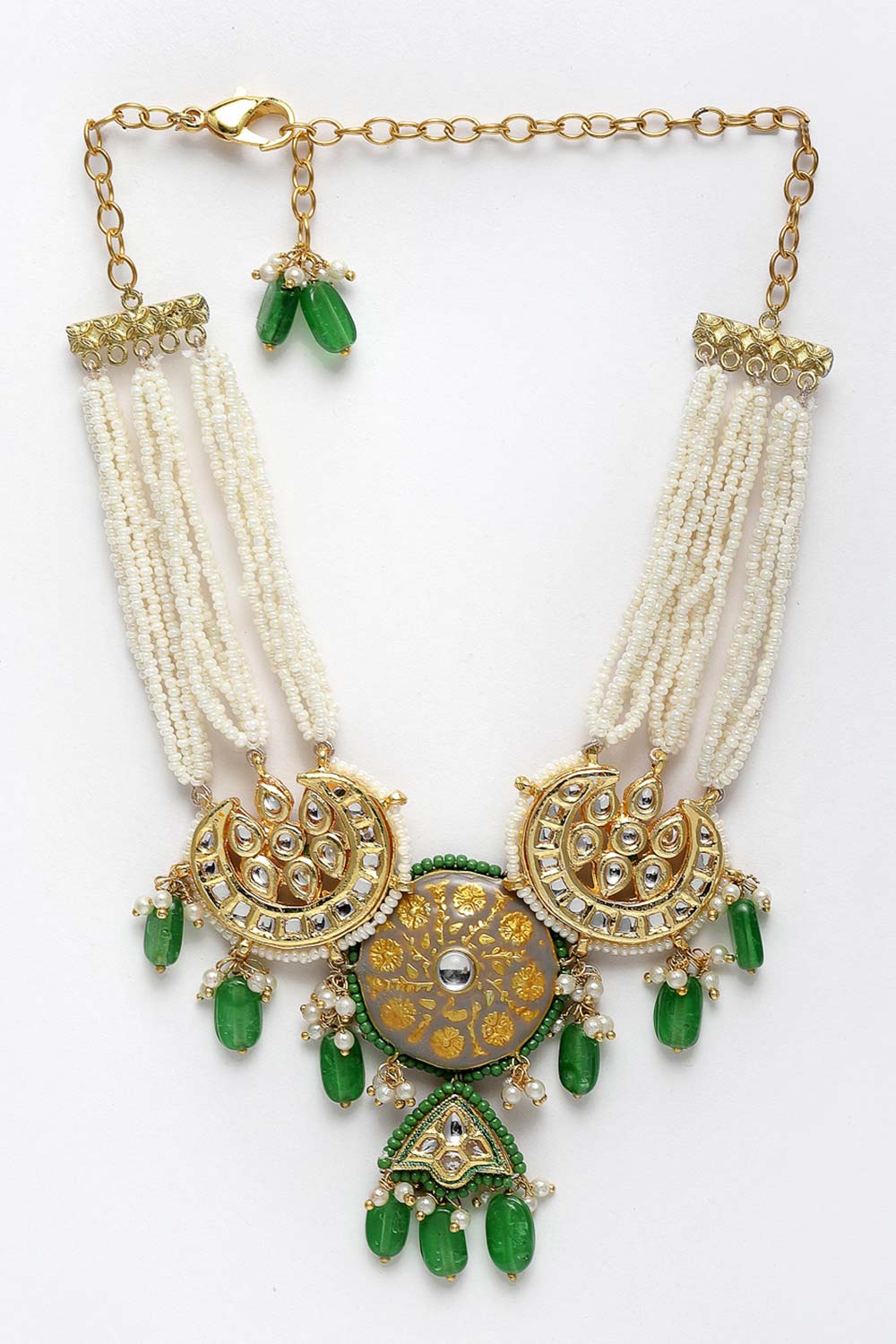 Green And Grey Gold-Plated Kundan And Pearls Necklace