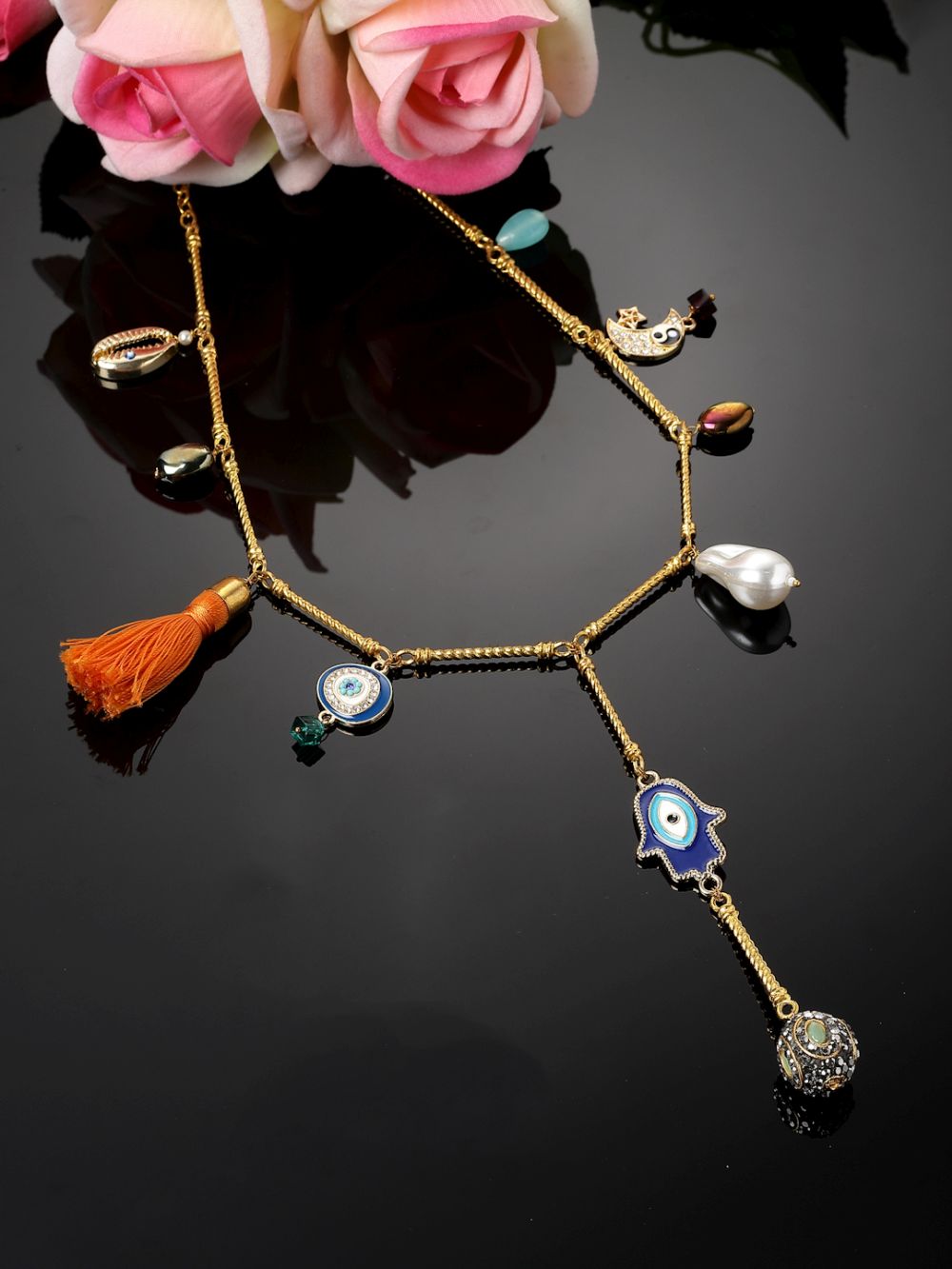 Orange And Blue Haar Necklace With American Diamonds And Pearls
