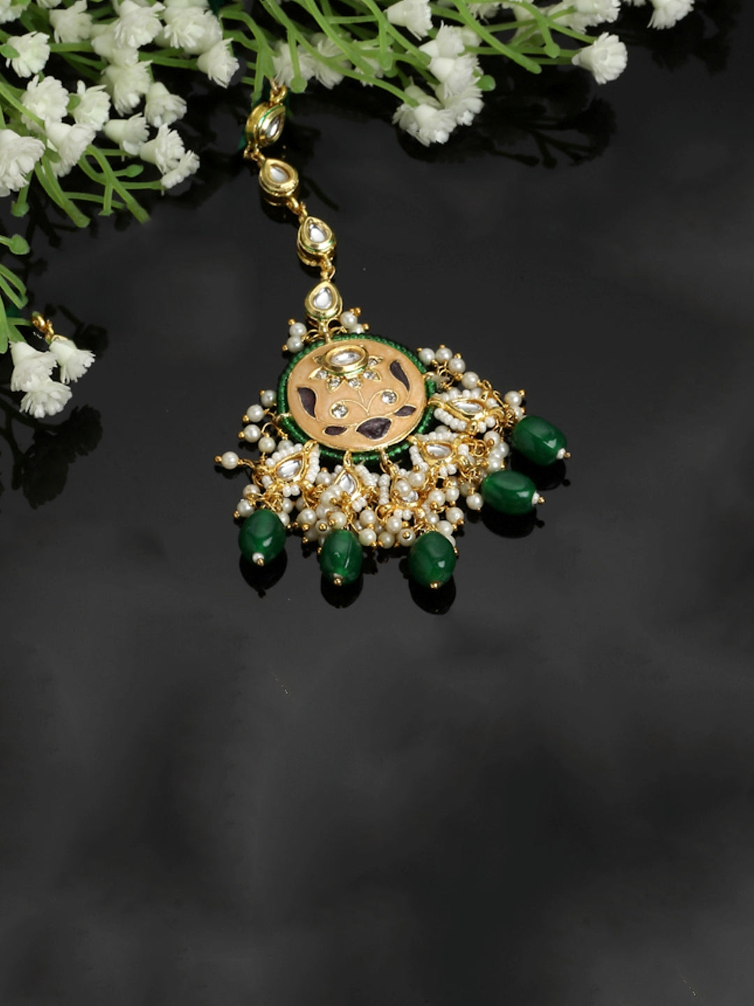 Peach And Green Gold-Plated Kundan And Pearls Mang Tikka
