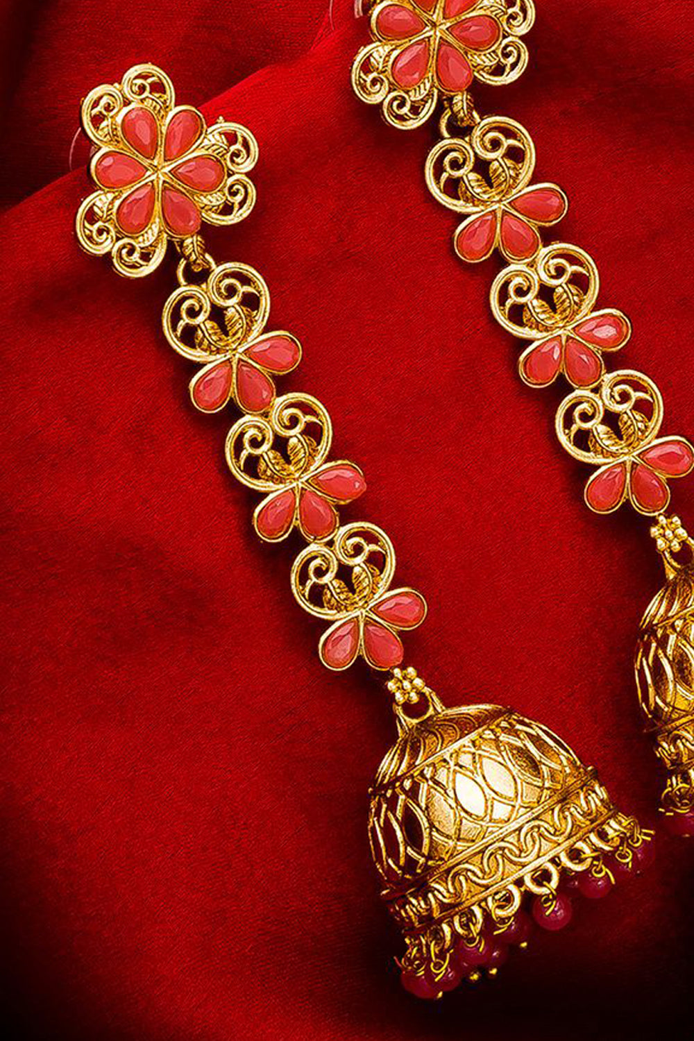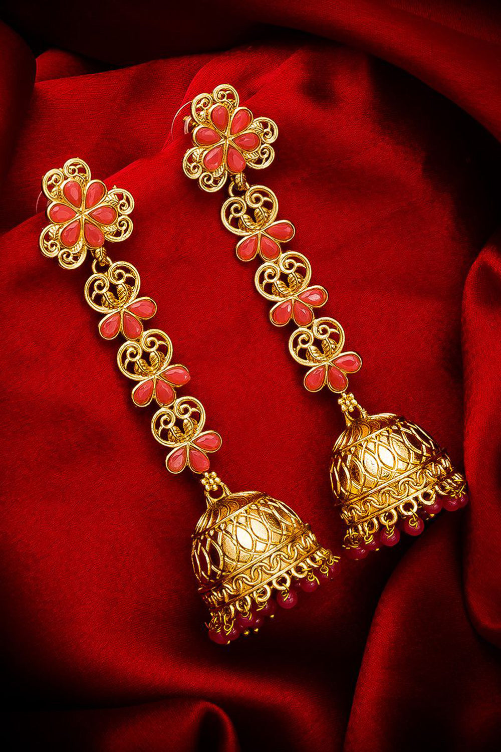 Women's Alloy Jhumka Earrings In Gold And Pink