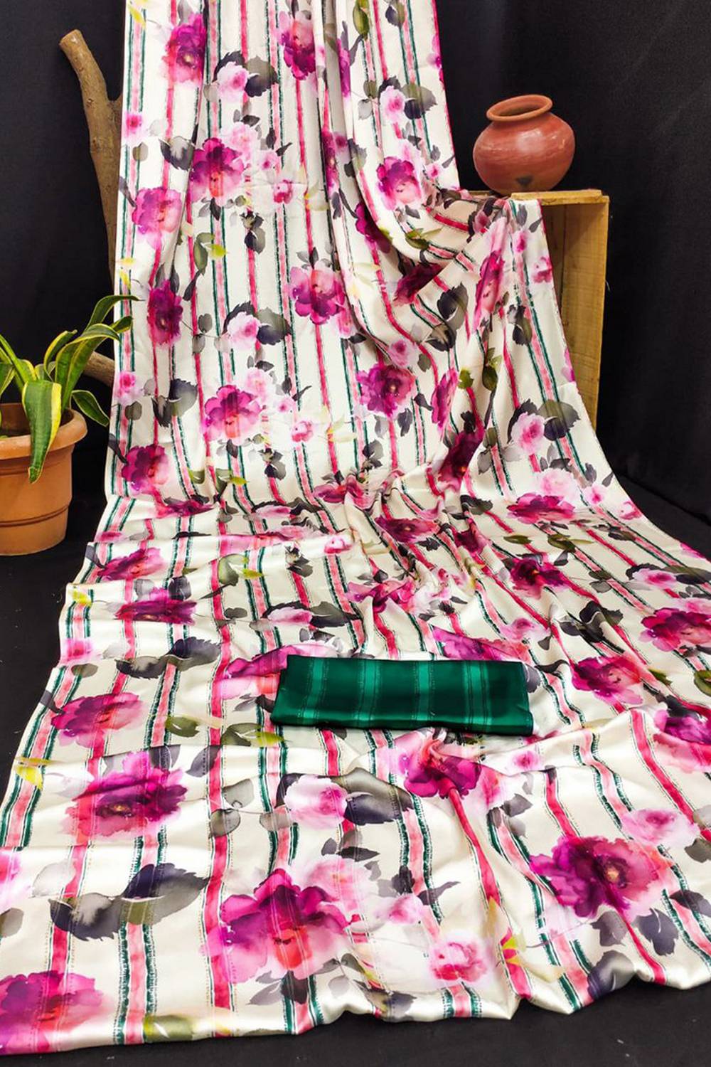 Elevate your wardrobe with our exquisite Saree a masterpiece crafted to add timeless elegance to your style. Made from Satin this saree offers a perfect mix of comfort and sophistication. Adorned with Floral Printed it showcases intricate craftsmanship that speaks volumes of tradition and artistry. Perfect for Casual this saree is a versatile addition to your collection, ensuring you stand out effortlessly. Pair it with elegant Jewelry, for a glamorous look. Add Clutches or Potli Bags and complete the ensemble with Wedges & Heels , making it a perfect choice for any event. Make a statement and embrace the elegance of Saree Today