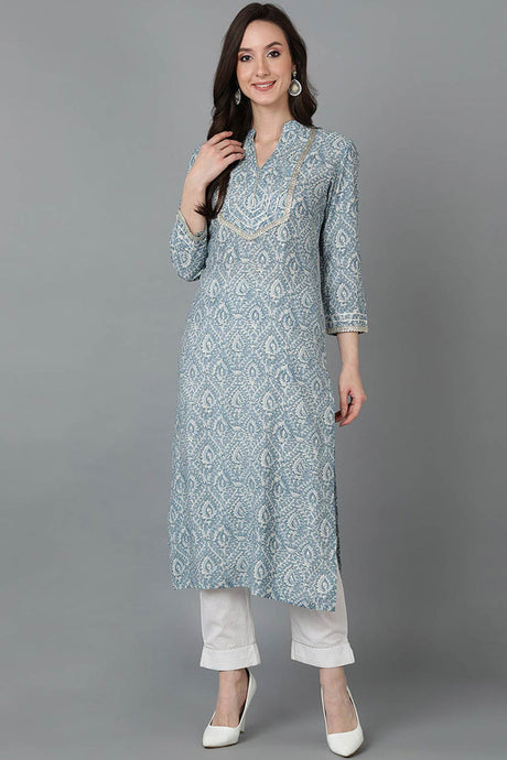 Indigo Blue Cotton Floral Printed Straight Kurti