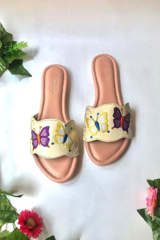 Soft Faux Leather Hand Embroidery Flats In Pink And Cream