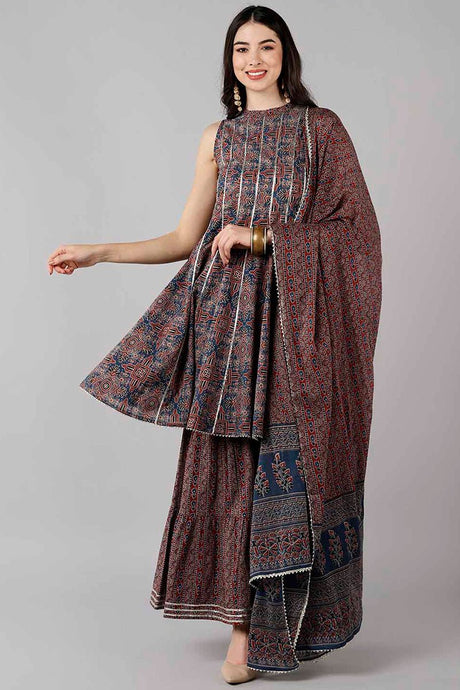 Navy Blue Poly Silk Straight Sharara Suit Set