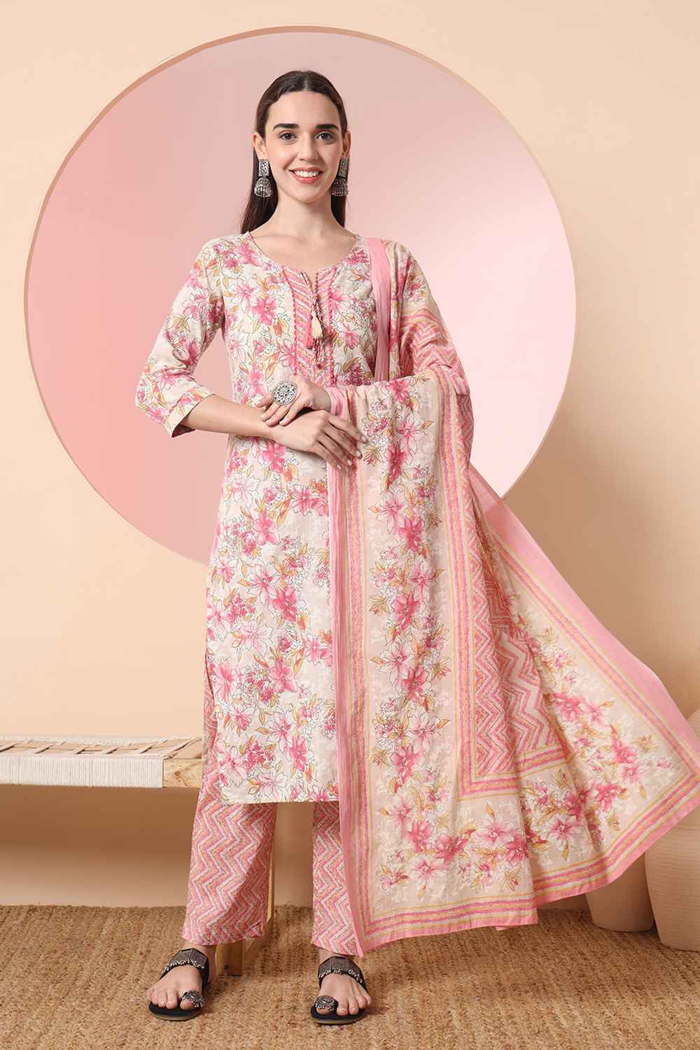 Stay stylish and comfortable with our Kurti Pant Set designed for all-day elegance. Made with Cotton this set is perfect for easy movement and timeless appeal. The beautiful and intricate Floral Print elevate its design for Casual, this kurti set is your go-to outfit. Pair it with elegant earrings and kolhapuri sandals or a heels for a traditional look or wedges for a modern edge