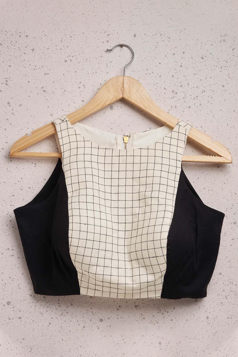 This chic black and white blouse features a front yoke with check detailing in white. Its boat neck adds a touch of elegance. Pair it with high-waisted jeans or team with a black pencil skirt for a polished look.