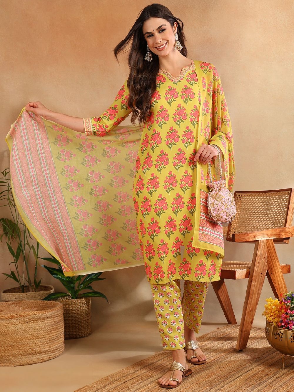 This ensemble is perfect for casual outings, family gatherings, or semi-formal events. The combination of the vibrant green color with the delicate floral print creates a visually appealing and refreshing look, while the rayon blend fabric ensures both style and comfort.