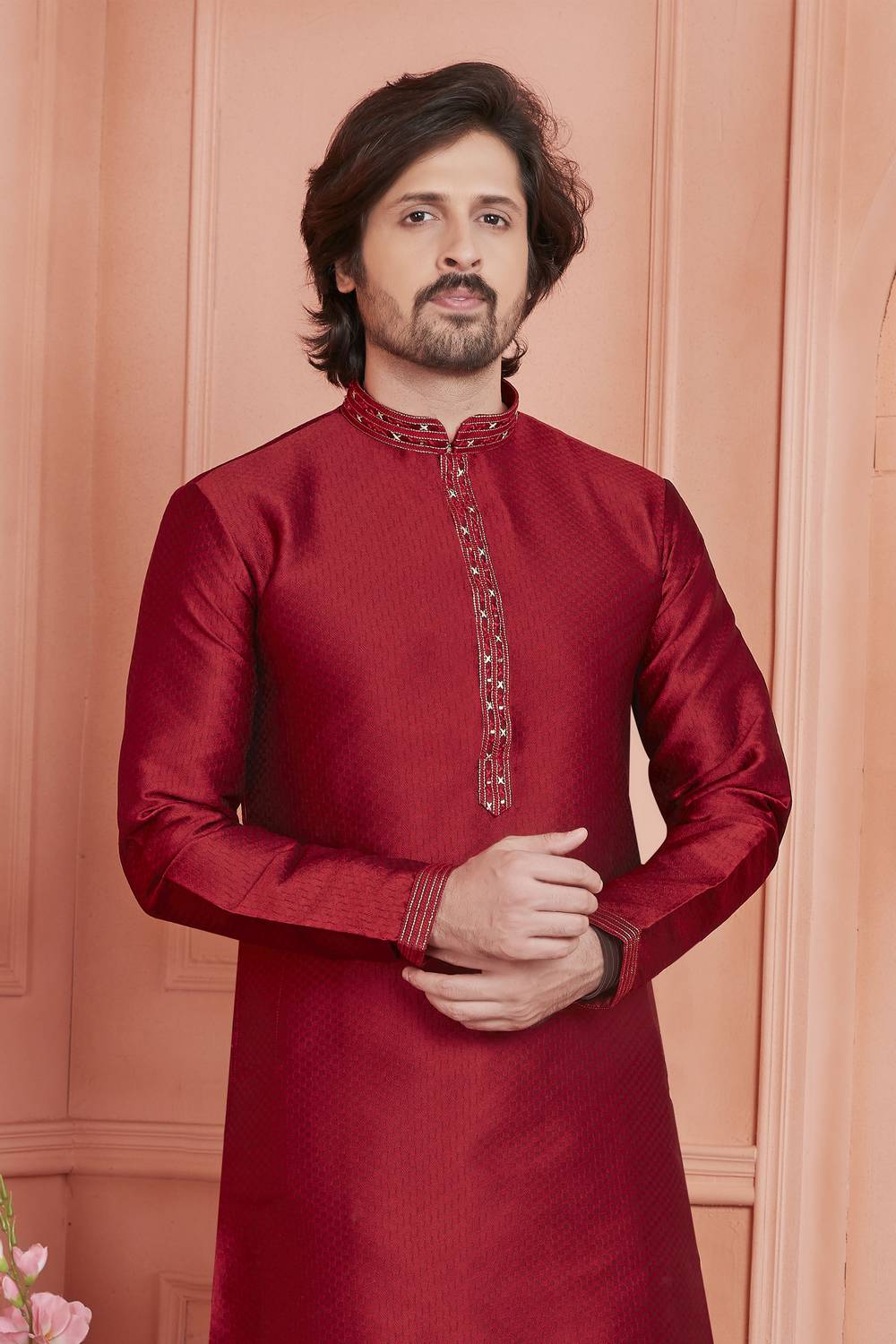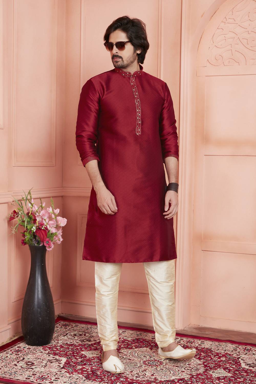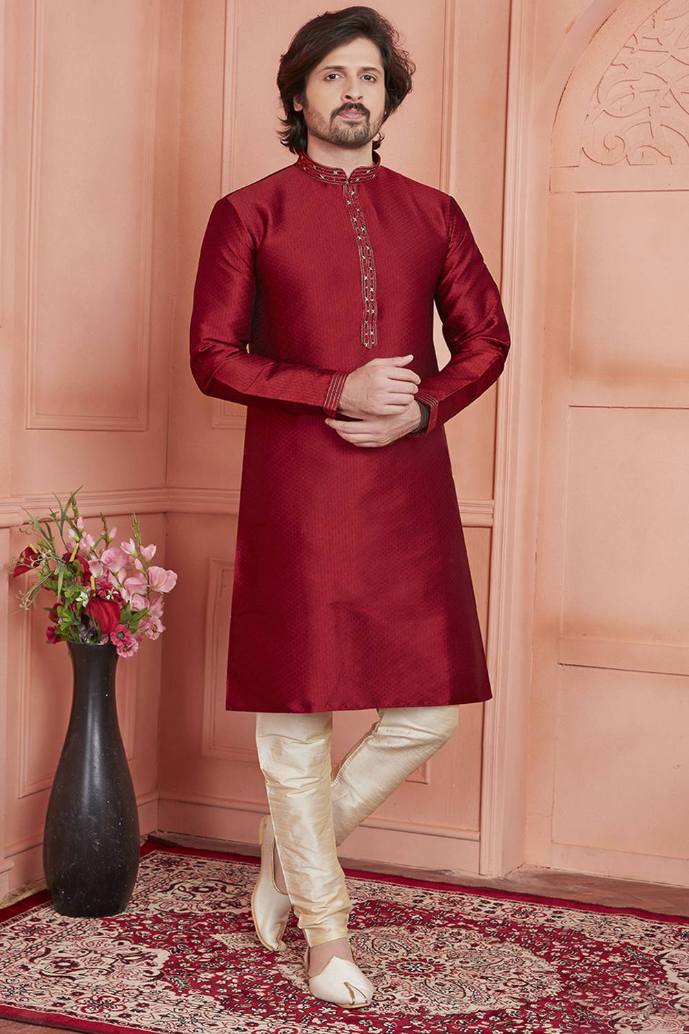 Maroon Embroidered Jacquard Kurta Pyjama Set