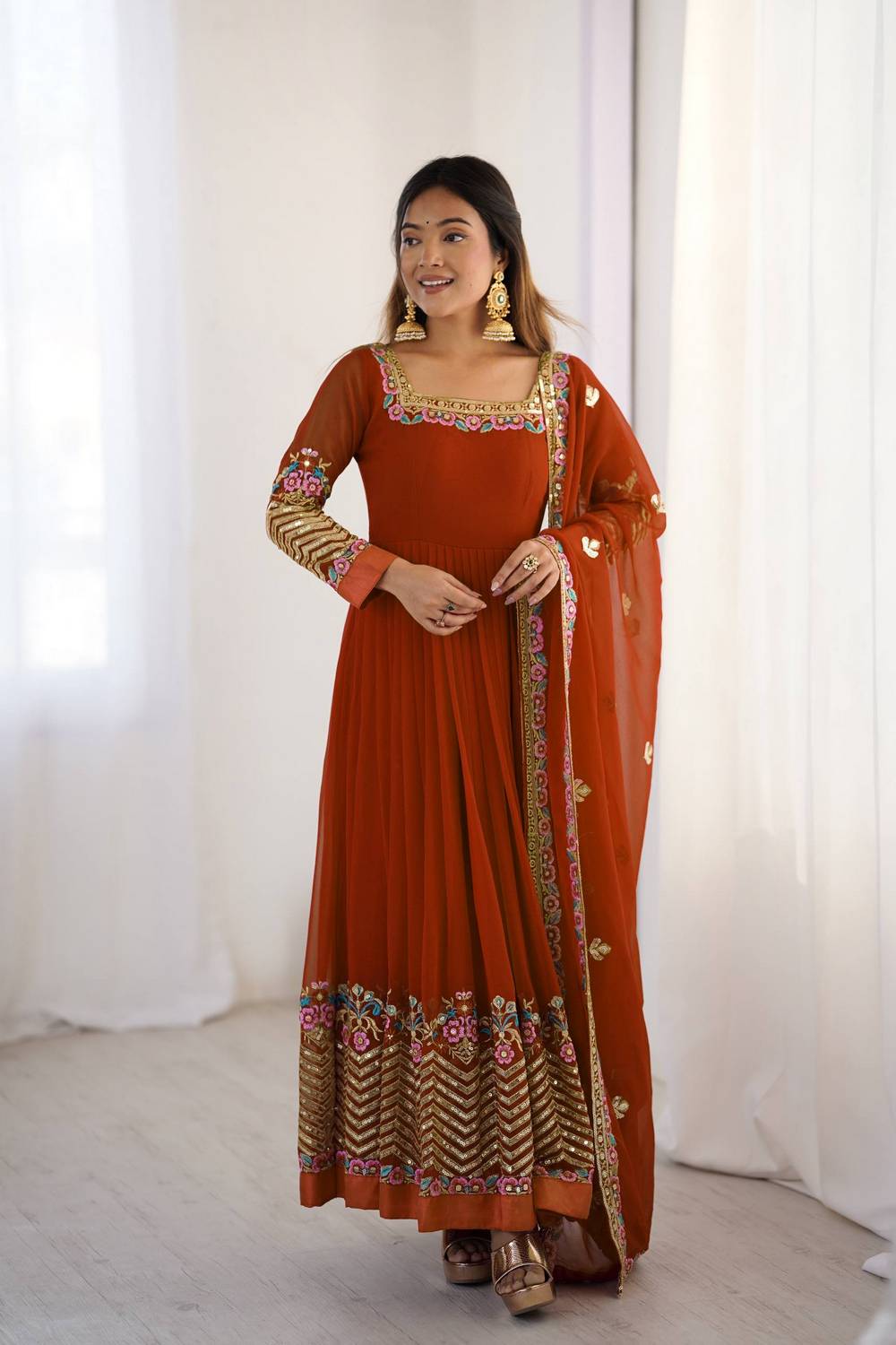Step into effortless style with our Anarkali Suits crafted for the modern woman who cherishes tradition. Made from soft Georgette it keeps you comfortable all day long. The Floral Embroidered design lends a touch of sophistication to your outfit. Perfect for Festive this is a must-have for versatile styling options. Style it with minimalistic accessories and flats for a casual look or jewelry and heels for special events