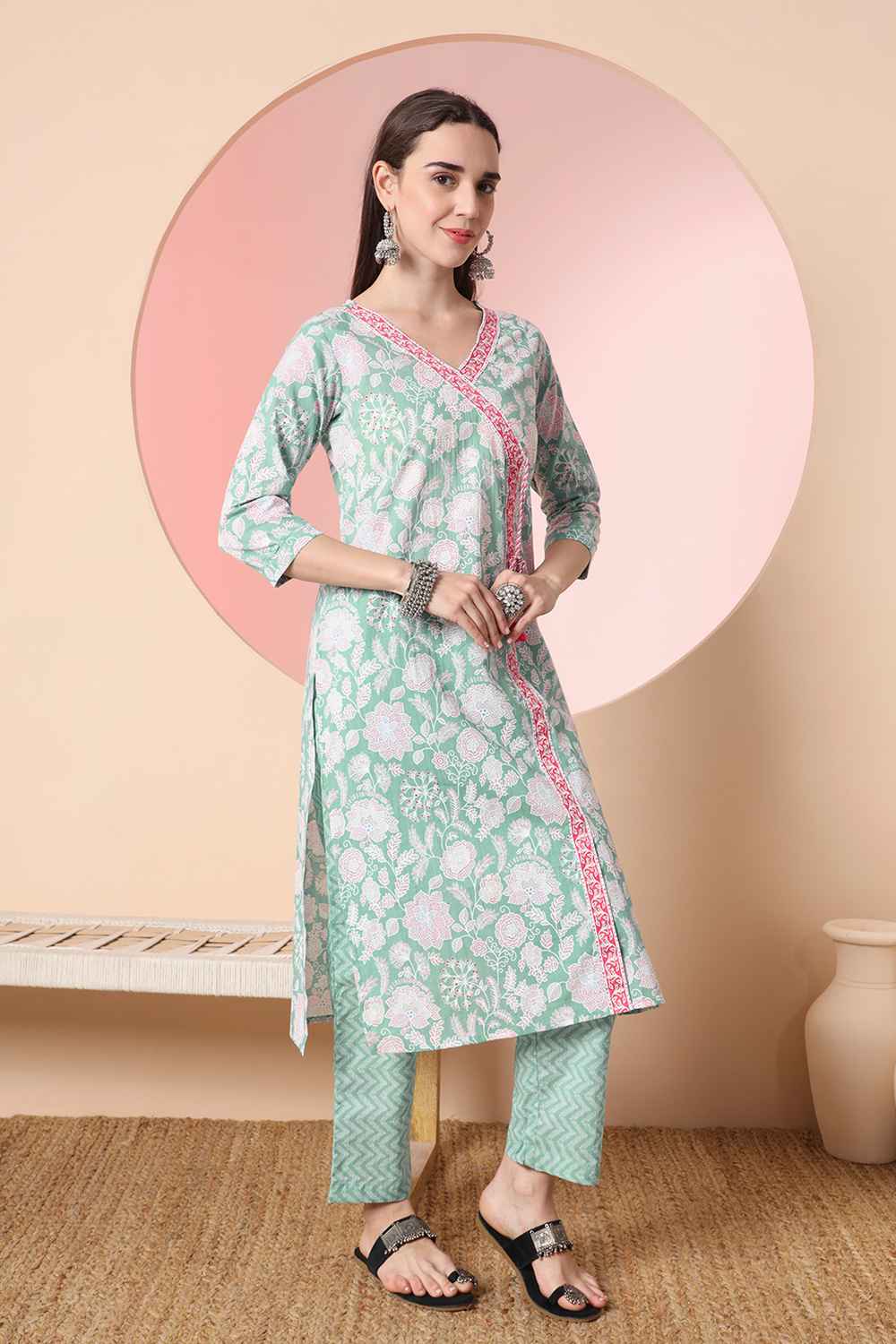 Turquoise Floral Printed Cotton Kurti Pant Set