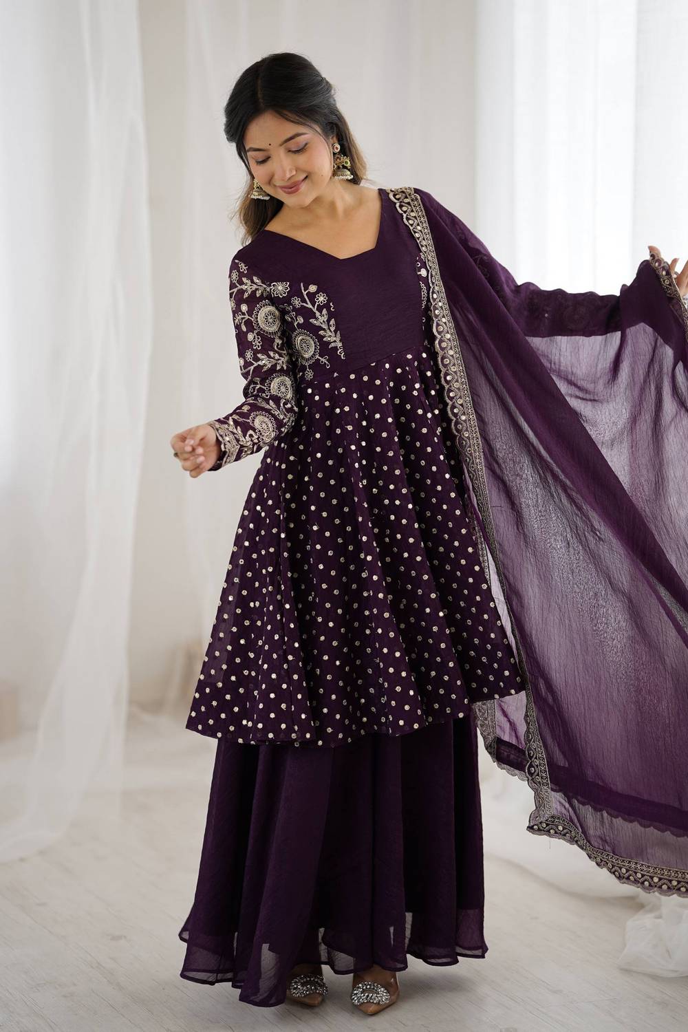 Step into effortless style with our Sharara Suits crafted for the modern woman who cherishes tradition. Made from soft Silk it keeps you comfortable all day long. The Floral Embroidered design lends a touch of sophistication to your outfit. Perfect for Party, Sangeet, Mehendi this is a must-have for versatile styling options. Style it with minimalistic accessories and flats for a casual look or jewelry and heels for special events