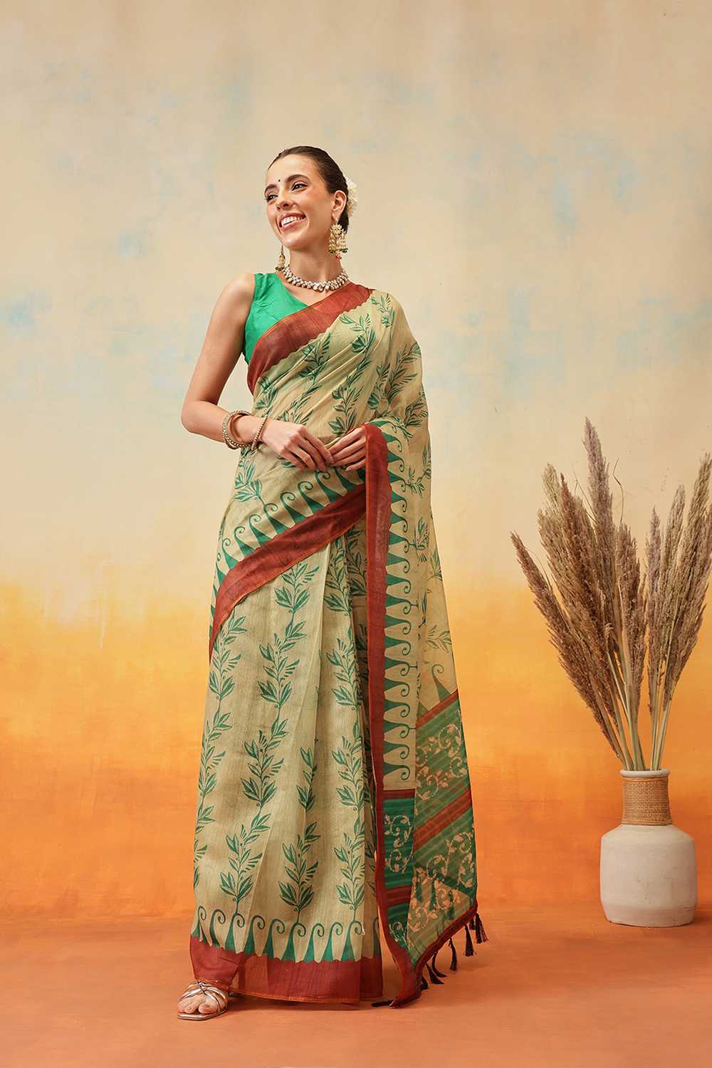 Elevate your wardrobe with our exquisite Ready to Wear Saree a masterpiece crafted to add timeless elegance to your style. Made from Cotton Blend this saree offers a perfect mix of comfort and sophistication. Adorned with Floral Printed it showcases intricate craftsmanship that speaks volumes of tradition and artistry. Perfect for Festive this saree is a versatile addition to your collection, ensuring you stand out effortlessly. Pair it with elegant Jewelry, for a glamorous look. Add Clutches or,potli Bags and complete the ensemble with Wedges & Heels making it a perfect choice for any event. Make a statement and embrace the elegance of Ready to Wear Saree today