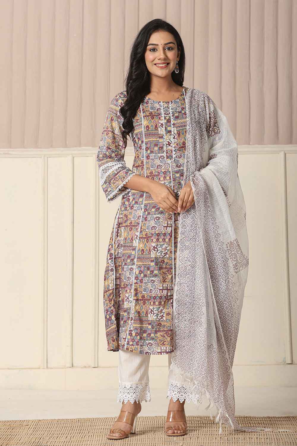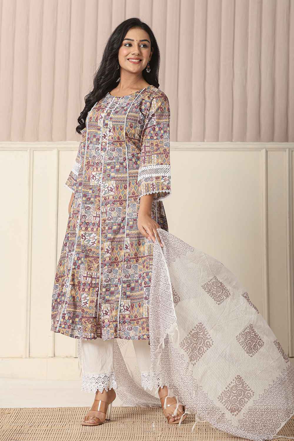 Beige Geometric Printed Cotton Anarkali Suit Set