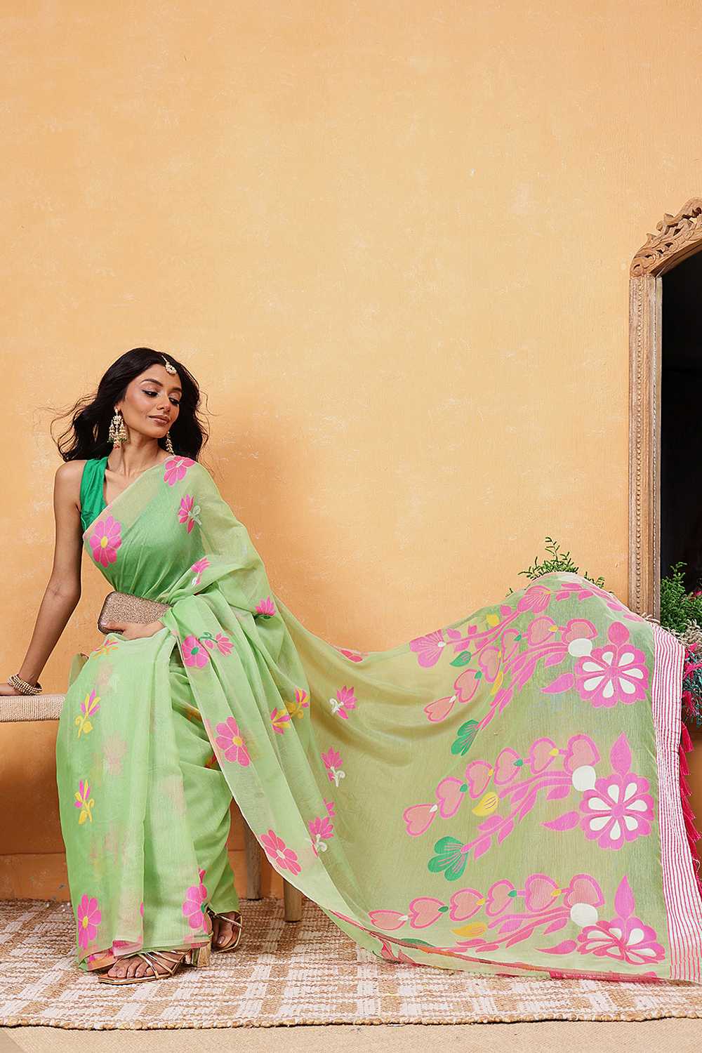 Elevate your wardrobe with our exquisite Ready to Wear Saree a masterpiece crafted to add timeless elegance to your style. Made from Cotton this saree offers a perfect mix of comfort and sophistication. Adorned with Floral Woven it showcases intricate craftsmanship that speaks volumes of tradition and artistry. Perfect for Festive this saree is a versatile addition to your collection, ensuring you stand out effortlessly. Pair it with elegant Jewelry, for a glamorous look. Add Clutches or,potli Bags and complete the ensemble with Wedges & Heels making it a perfect choice for any event. Make a statement and embrace the elegance of Ready to Wear Saree today