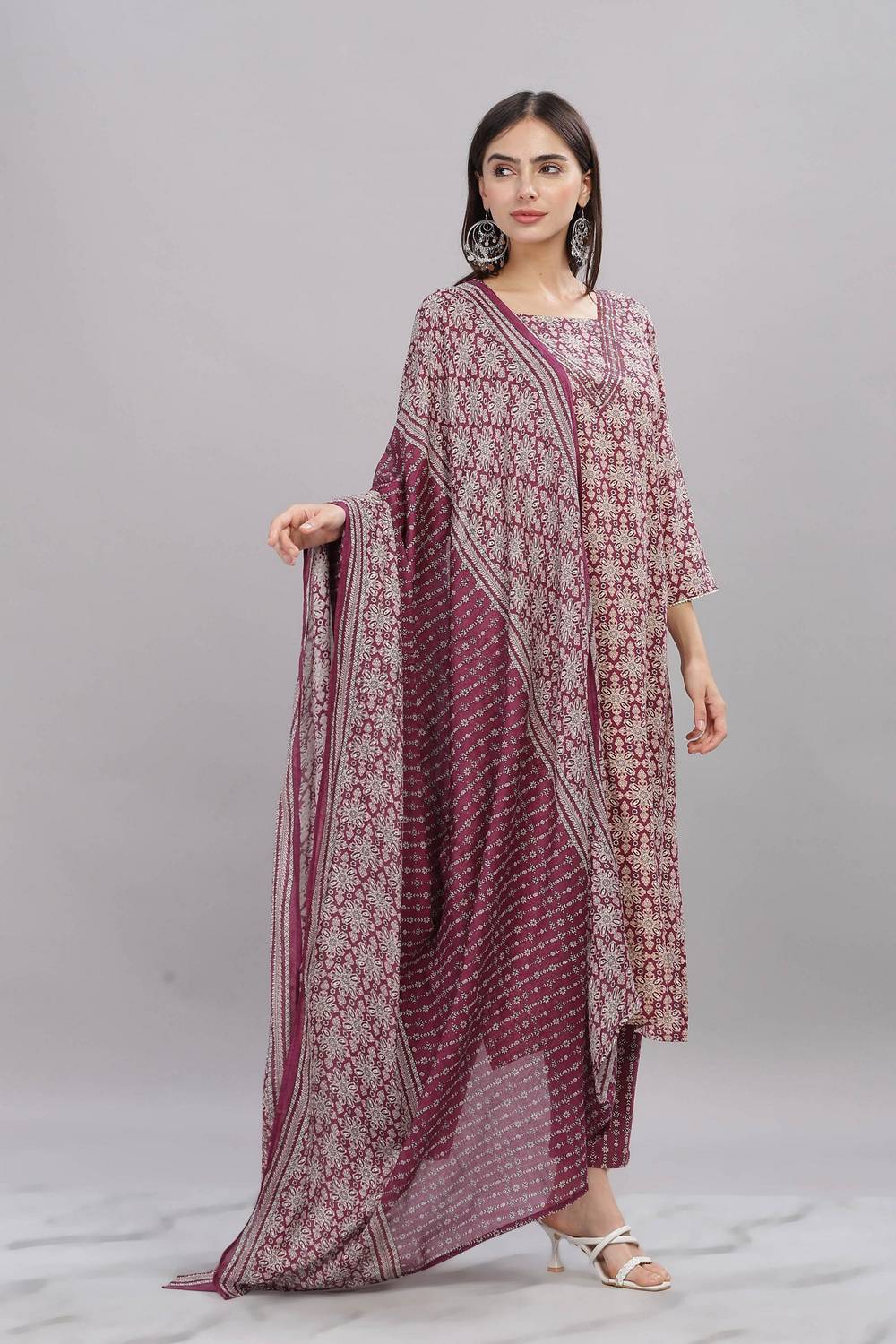 Maroon Ajrakh Printed Rayon Kurti Pant Set