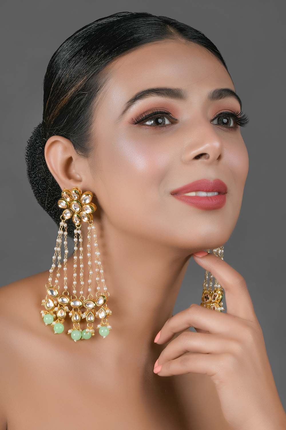 Upgrade your outfit with our Earring a dazzling pair of earrings designed to make a statement. Crafted from Copper and adorned with Embellished with kundan & Meenakari on back side these earrings are perfect for Partywear. Lightweight and versatile, they complement both traditional and modern outfits. Pair them with a matching necklace or wear them solo for effortless glamour.