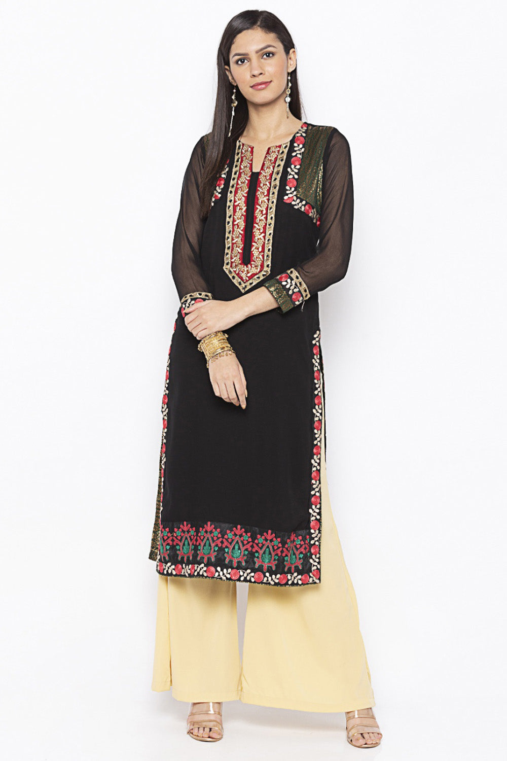 Black georgette straight cut Kurti with brocade detailing on yoke and sleeves embroidery on yoke three quarter sleeves side slits and hemline
